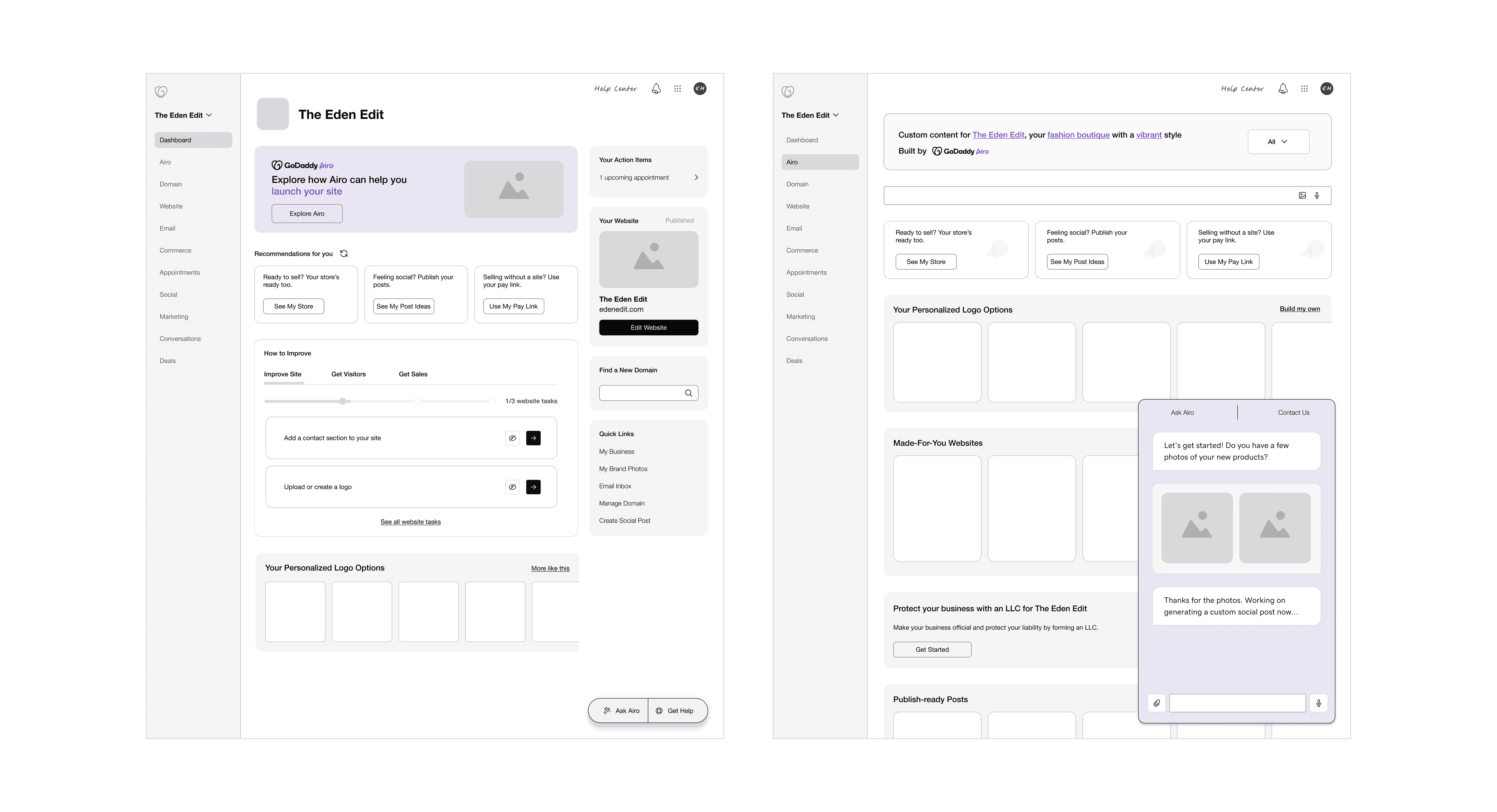 Fresh off the blitz, we moved straight into Near Star, a one-month initiative to test our Airo Home concept in action. We were curious to visualize a singular flow where Airo Assistant provides continuous support across changing product surfaces, mirroring the journey of a typical GoDaddy customer. This time, we designed for Eden, a fashion boutique owner.