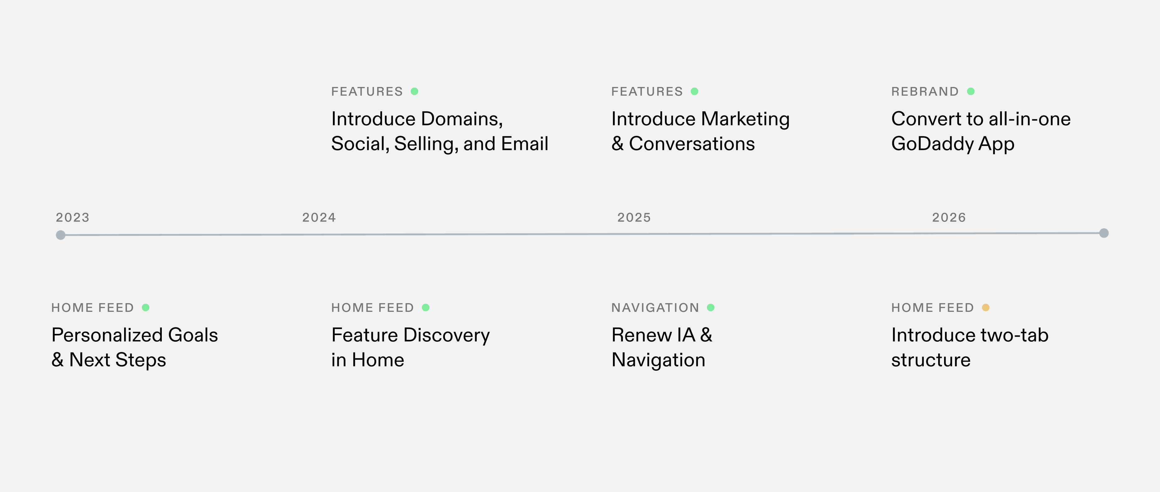 Studio 9 was a north star. The vision drove a series of initiatives — personalized onboarding, goal-based recommendations, and ultimately a full evolution into the GoDaddy app with new navigation and home.